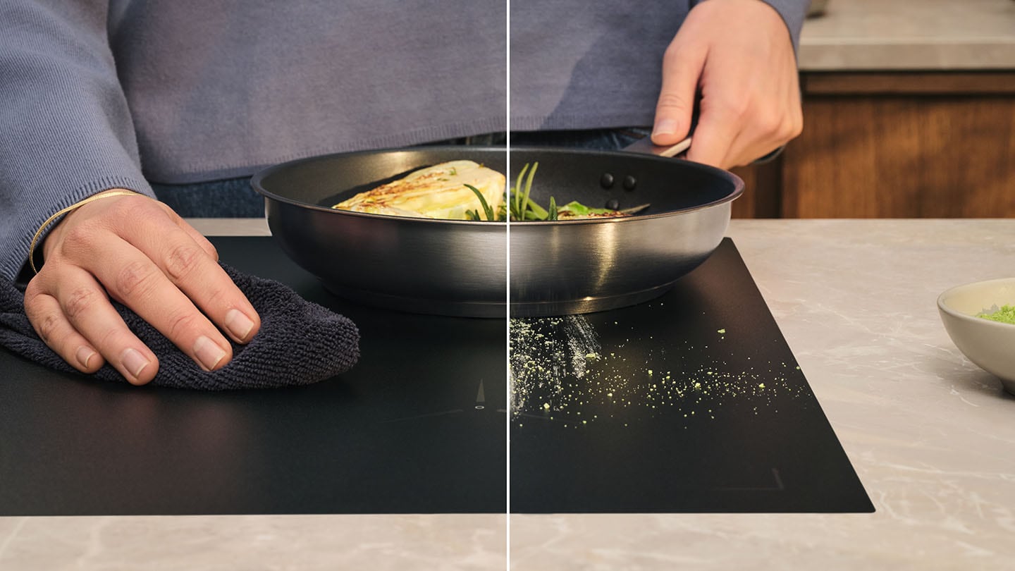 Das SaphirMatt® Kochfeld sieht nicht nur elegant aus, sondern bietet im Vergleich zu unserem Standard-Keramikglas einen erhöhten Schutz vor Kratzern. Darüber hinaus ist es unempfindlich gegenüber Fingerabdrücken.