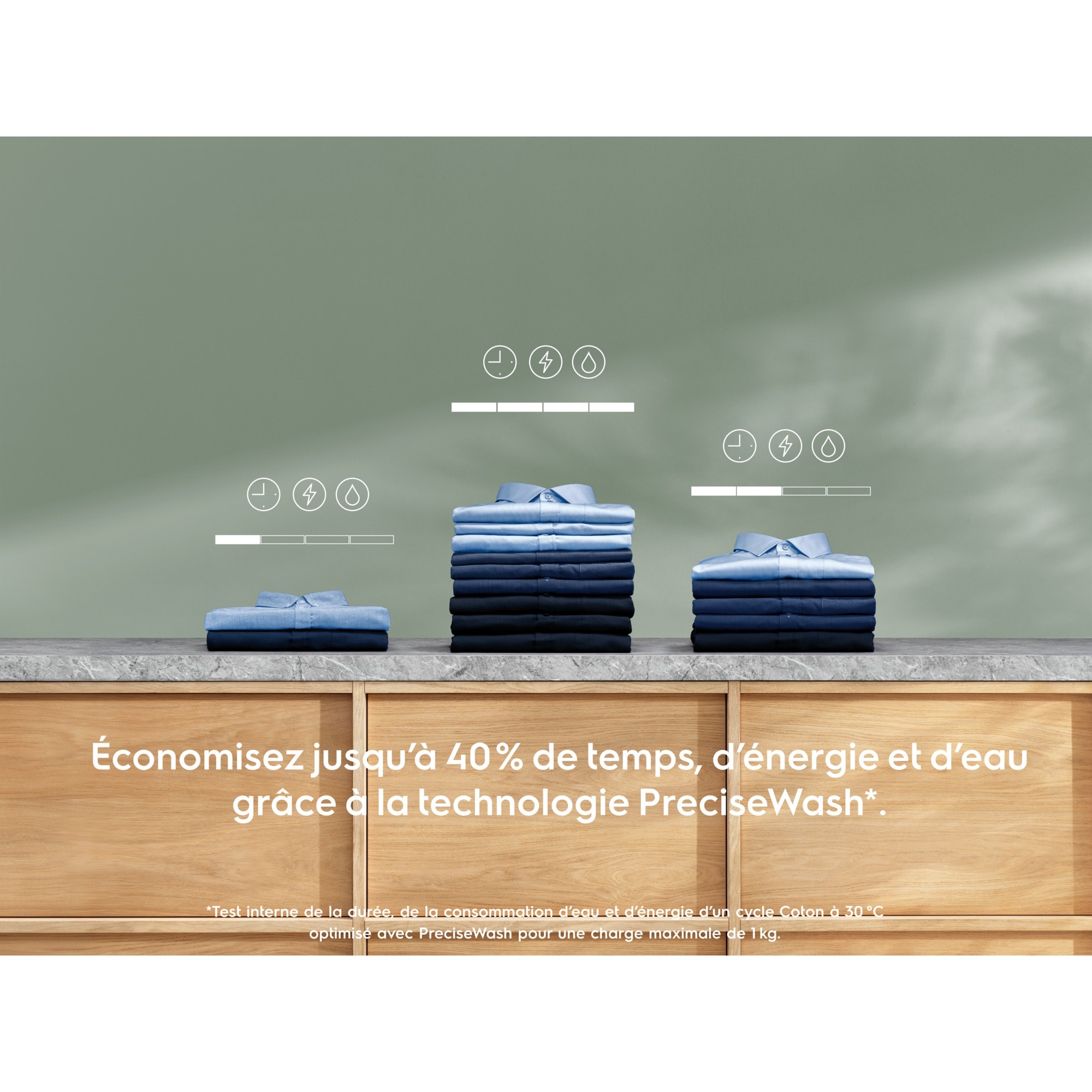 ***Avec le programme AbsoluteWash de 49 min, vous nettoyez en profondeur à 30 °C et économisez plus de 30 % d’énergie par rapport à un programme coton à 40 °C.