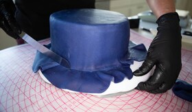 Der Schriftzug ist aus Blütenfondant gemacht. Achtung: Blütenfondant wird schnell hart. Sobald die Buchstaben ausgestochen sind, in Vakuumsäcklein geben und gut verschliessen. Den Schriftzug mit essbarem Kleber bestreichen und sofort an der Torte anbringen. Jede Torte steht auf einem Torten-Karton, welche erhältlich bei Grossverteiler sind.
