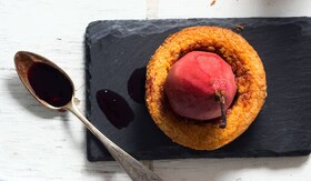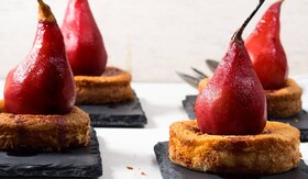 5. Williams Birnen in einen kochfesten Vakuumbeutel geben und den Portwein mit den Gewürzen dazugeben, vakuumieren und Sous-Vide garen.