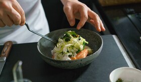 Eine Portion des Blumenkohl-Pürees mit einigen Blättern Federkohl in eine kleine Schüssel geben. Den Lachs nach Ablauf der Garzeit aus dem SousVide-Beutel nehmen und trocken tupfen. Auf dem Blumenkohl-Püree platzieren. Salz, Zucker, Essig und Öl mischen und die beiseitegelegten Blumenkohl-Scheibchen darin marinieren. Mit der Flüssigkeit über den Lachs geben und servieren.