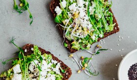 Starte Deinen Tag mit einem schnell zubereiteten Avocadobrot mit Feta-Käse, versehen mit frischen Sprossen.