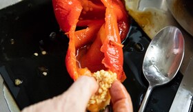 Peperoni und Auberginen auf ein mit Backpapier belegtes Blech legen und im Backofen während ca. 30 Min. bei 230°C backen, bis die Haut der Peperoni dunkle Blasen hat. Danach die Gemüse in eine Schüssel geben und zudecken.