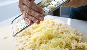 Butter und Kartoffeln mit der Röstiraffel darüber raffeln. Alles leicht andrücken und dann in der Mitte falten. Die Ränder gut zusammendrücken, damit die Füllung gut eingeschlossen ist.