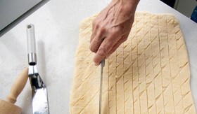 Danach alles ca. ½ cm dick auswallen. Mit einem Messer ein Gittermuster einritzen und mit einem Glas oder Ausstecher runde Pogatschen ausstechen.