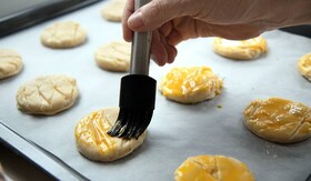 Mit Eigelb bestreichen und mit Kümmel und Meersalz bestreuen.