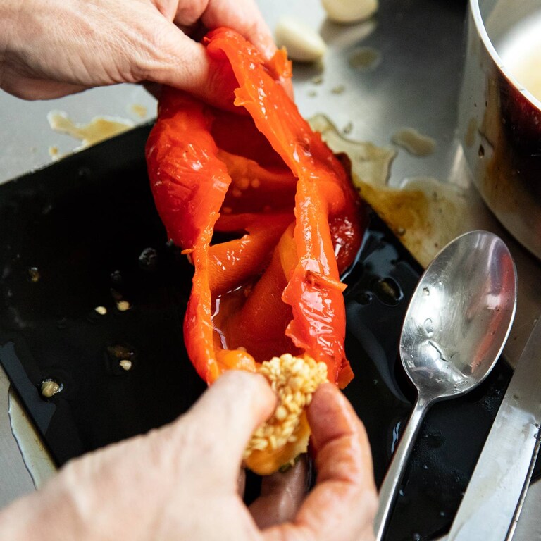Peperoni und Auberginen auf ein mit Backpapier belegtes Blech legen und im Backofen während ca. 30 Min. bei 230°C backen, bis die Haut der Peperoni dunkle Blasen hat. Danach die Gemüse in eine Schüssel geben und zudecken.