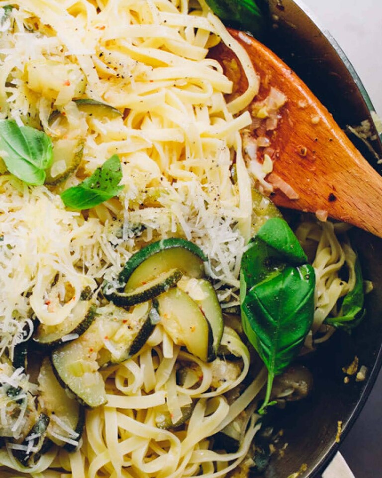 3. In der Zwischenzeit die Nudeln nach den Anweisungen auf der Packung kochen. Abtropfen lassen, wenn die Nudeln noch etwas al dente sind. Zusammen mit dem Basilikum in die Pfanne geben und umrühren. Mit geriebenem Parmesankäse, frisch gehacktem Pfeffer und einem Schuss Olivenöl bedecken.