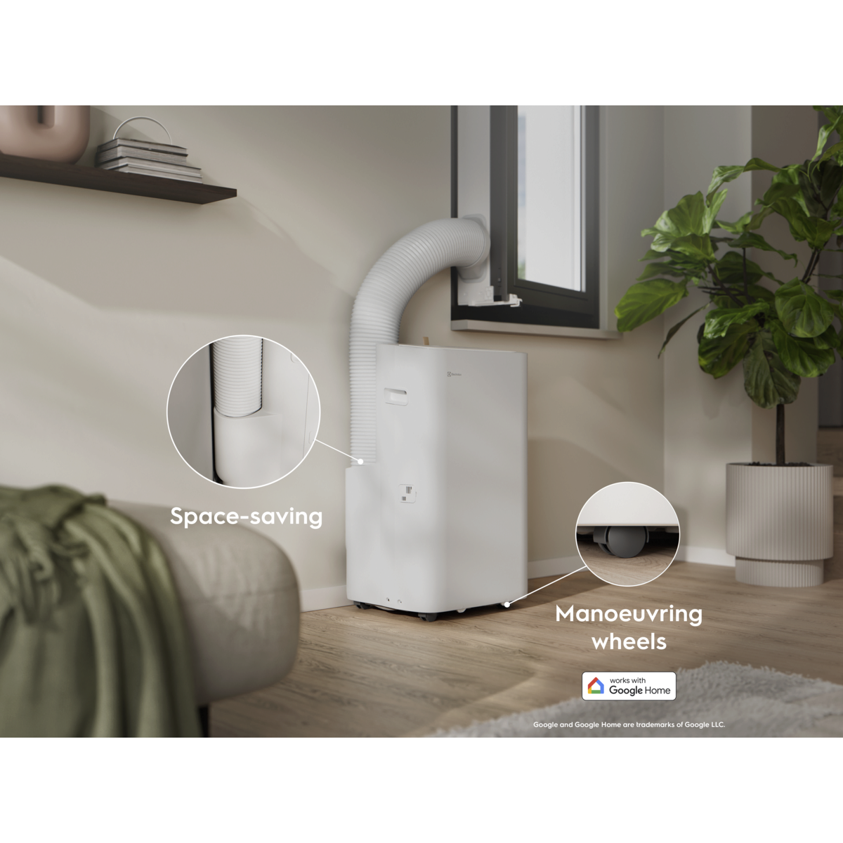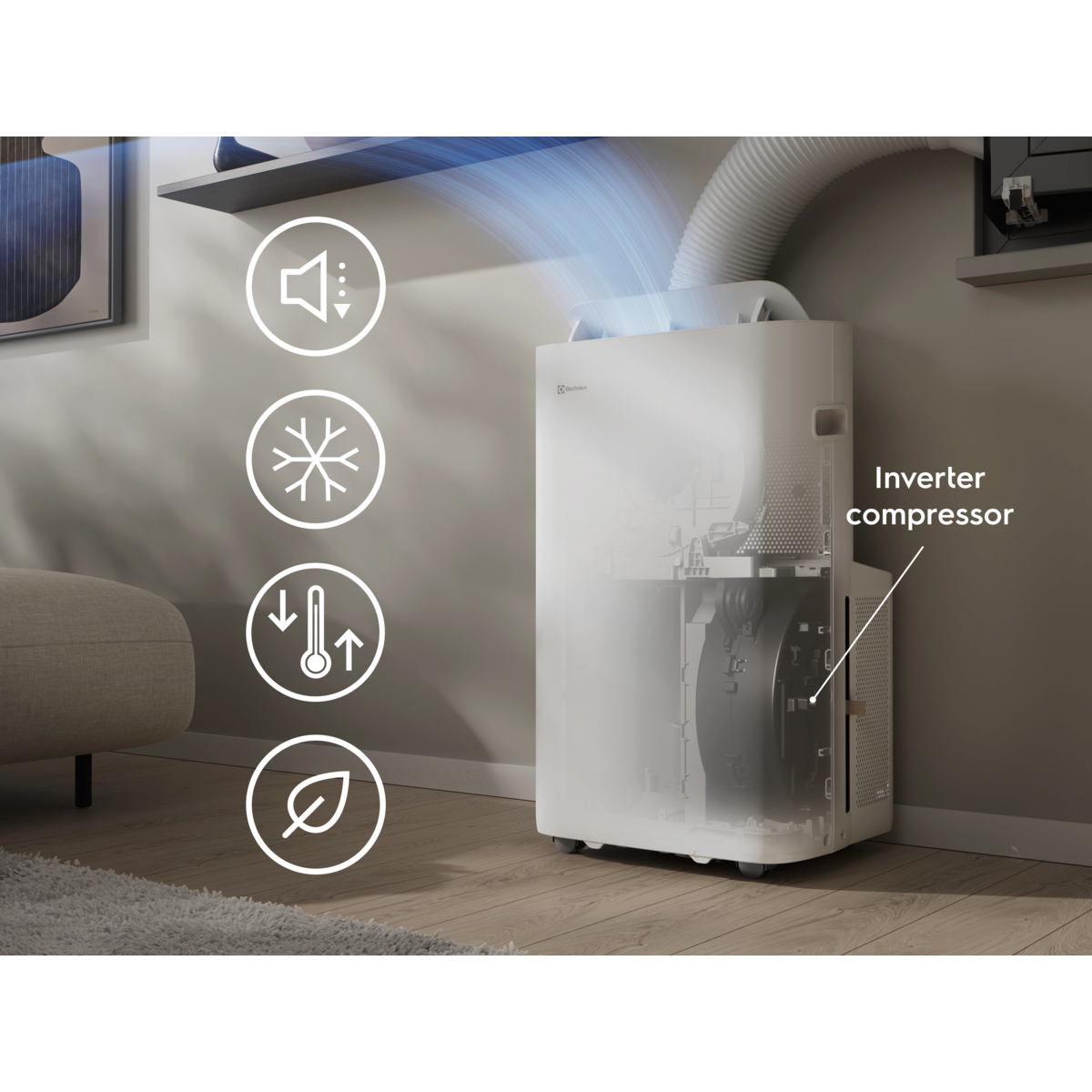 Bewahren Sie einen kühlen Kopf mit dem Electrolux 700 multifunktionalen mobilen Klimagerät. Eine Komplettlösung für Kühlung, Entfeuchtung, Belüftung und Luftreinigung, ausgestattet mit modernster Inverter-Technologie für höchste Effizienz und flüsterleisen Betrieb.